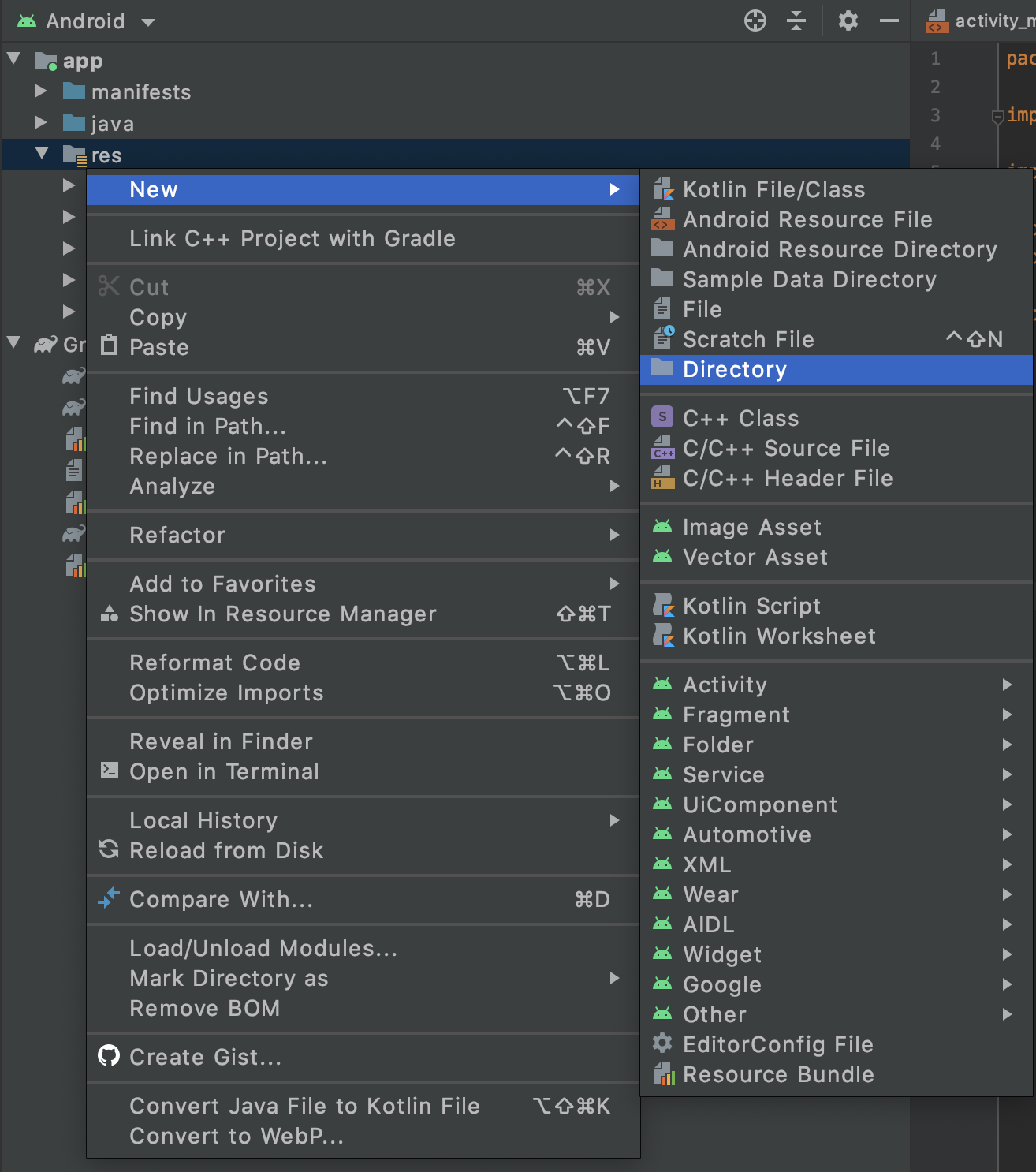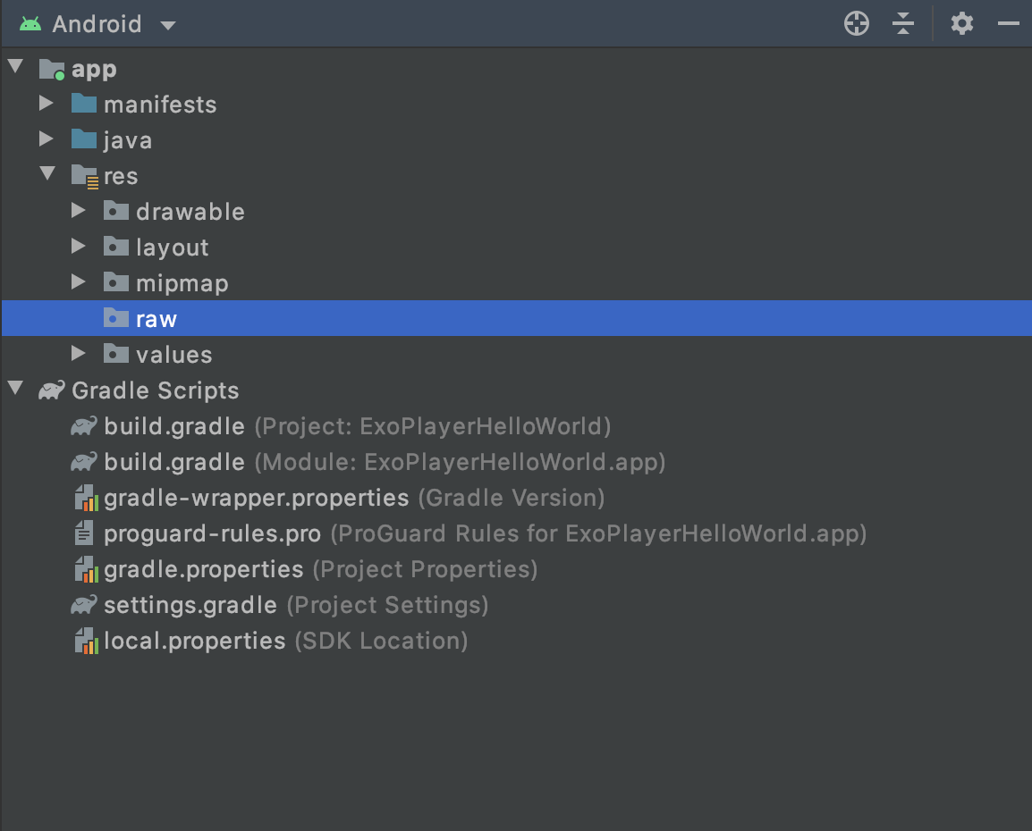 안드로이드 프로젝트에서 이미지, 동영상, 음악 등의 리소스 파일들은 raw 폴더에 넣어 관리를 합니다. 하지만 프로젝트 생성 시 따로 raw 폴더가 생성되어있지 않기 때문에 직접 만들어줘야 합니다. 이번 음악 플레이어에 음악을 넣어 재생을 하기 위해서는 raw폴더가 필요합니다. 다음의 이미지를 참고해서 raw 폴더를 만들어 보겠습니다.